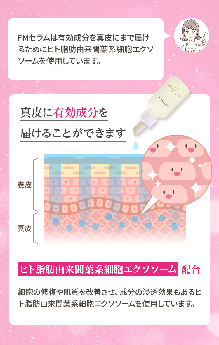 アロエベラ葉水、モモ果実水、水、グリセリン、3-グリセリルアスコルビン酸、ヘキシル3-グリセリルアスコルビン酸、ヒト幹細胞順化培養液、ヒト脂肪由来間葉系細胞エクソソーム、コメ発酵液、ピロリジニルジアミノピリミジンオキシド、加水分解アナツバメ巣エキス、プラセンタエキス、ヒト遺伝子組換オリゴペプチド-1(ヒトオリゴペプチド-1)、ヒト遺伝子組換ポリペプチド-3(ヒトオリゴペプチド-5)、ヒト遺伝子組換ポリペプチド-11(ヒトオリゴペプチド-13)、マンゴスチン果皮エキス、クロレラ/シロバナルーピンタンパク発酵物、クインスシードエキス、ローマカミツレ花エキス、トウキンセンカ花エキス、ヤグルマギク花エキス、カミツレ花エキス、セイヨウオトギリソウ花/葉/茎エキス、フユボダイジュ花エキス、サクシノイルアテロコラーゲン、ヒアルロン酸Na、加水分解ヒアルロン酸Na、ユビキノン、カルニチン、レシチン、グルコシルヘスペリジン、ナイアシンアミド、パントテン酸Ca、酢酸トコフェロール、アスコルビルリン酸Na、ピリドキシンHCl、オクテニルコハク酸デンプンNa、マルトデキストリン、シリカ、アスコルビルメチルカルボニルペンタペプチド-72-トリ-t-ブチルトリプトファナミド、トリ(カプリル酸/カプリン酸)グリセリル、水添レシチン、1,2-ヘキサンジオール、ポリソルベート80、カプリリルグリコール、PEG-150、PEG-60水添ヒマシ油、ポリ(シアノアクリル酸ブチル)、キサンタンガム、BG、エタノール、変性アルコール、フェノキシエタノール